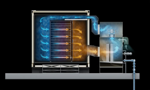 AirXは、冷水コイル、直膨コイル、外気冷却機構を備えたハイブリッド構造を持つ空調機で、コンテナ型データセンターを設置した環境の温度に合わせて最適化された冷却方式を自動で選択し、コンテナ内の熱を奪い、冷却する。