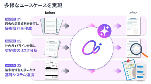 例えば、過去の提案資料を参考にして資料を作成したり、社内ルール・ガイドラインに基づいて契約書のリスク分析を行ったり、請求書から情報を読み取って基幹システムに連携したりといった利用が可能で、利用企業は、固有の多様な業務にすみやかにAIエージェントを導入できるとした。