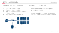 同氏は、さくらONEのほかのGPUスーパーコンピューターとの共通点として、Beowulf型のHPCクラスタや、ジョブスケジューラ、Singularityコンテナなどに対応するため、ほかのGPUスーパーコンピューターでやっている計算をさくらONEで実行できると説明した。