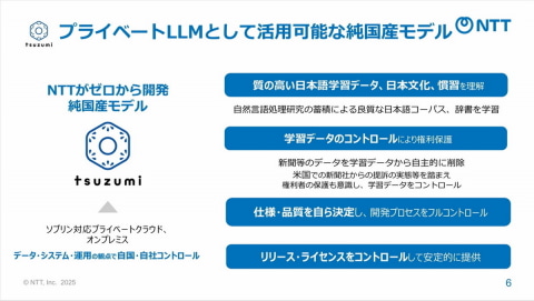 純国産AIとしてのこだわりについても、「海外モデルをベースに日本語を追加学習するケースとは異なり、tsuzumi 2では開発プロセスから著作権やライセンスまでを完全にコントロールできる」(木下氏)として、最初から国産AIとして構築することの重要性を強調した。