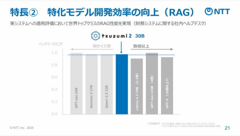 特化型モデルの開発については、RAGとファインチューニングによって開発効率が向上したという。木下氏は、「NTTの財務システムに関する社内ヘルプデスクに活用したところ、世界トップクラスのRAG性能を実現したほか、ファイナンシャルプランナー2級試験において、他モデルより少ないチューニングデータで合格ラインに達した」と事例を挙げた。