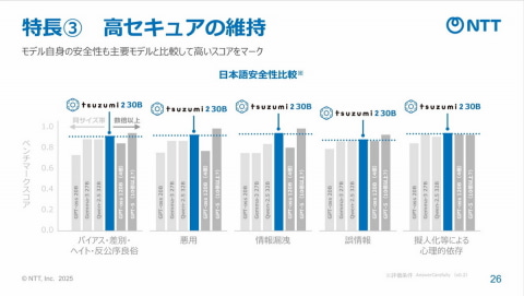 日本語性能については、世界的なベンチマークの平均値から、「日本語知識・解析力・指示遂行力・安全性の4項目で、同サイズ帯のモデルで世界トップクラスの日本語性能を発揮し、数倍以上大きなモデルにも引けを取らない性能を見せた」と木下氏。