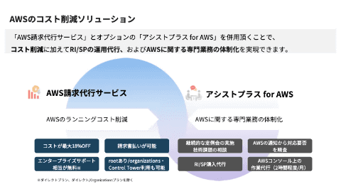 問い合わせ対応や技術相談などで専門エンジニアが伴走する(平日9時〜17時)。RI/SPの提案・購入代行によってAWS利用料の削減を実現する。また、AWS請求代行サービスと併用することで、AWS利用料が最大10%割引になるなどのメリットが得られる。