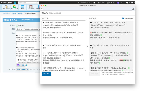 サイボウズ Officeでは、掲示板やメッセージ、メール本文の内容をAIが自動でまとめて要約する「要約AI」、文章の誤字や脱字をチェックして修正案を提示する「校正AI」、サイボウズ Officeの使い方や機能についてチャットでAIに質問できる「ヘルプAI」の各機能が追加される。2026年1月のアップデートで提供開始される予定だ。
