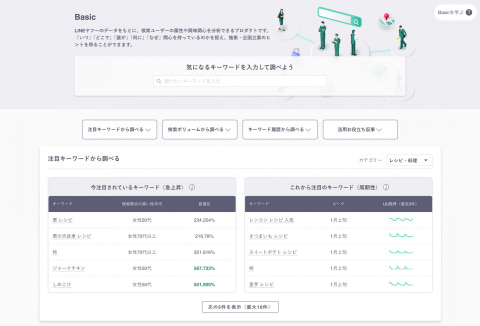 具体的な改善としては、分析の目的に応じて「調べ方」を選べるナビゲーションボタンをトップに設置した。検索が急上昇している「注目キーワードから調べる」、1カ月の性年代別ランキングに基づく「検索ボリュームから調べる」、過去に入力した「キーワード履歴から調べる」など、探索できるようになり、「何から調べたらいいのか」という迷いを解消するとしている。