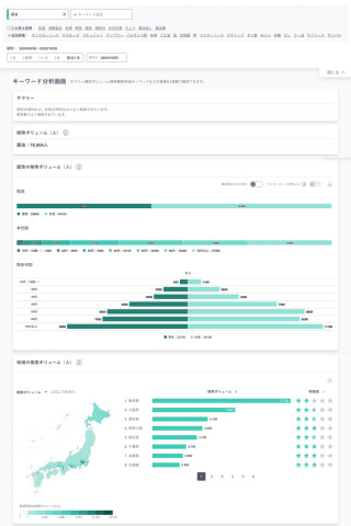 また、従来の「基本画面」と「キーワード比較」を「キーワード分析」として統合した。ここでは、特定のキーワードに対し、性別・年代・地域など複数の観点から検索傾向を可視化でき、多様なグラフや分布図、ランキングにより、「どのような人が」「いつ」「どんな興味関心を持っていて」「なぜその興味関心を持っているのか」といった、キーワードの全体感を把握できるとのこと。
