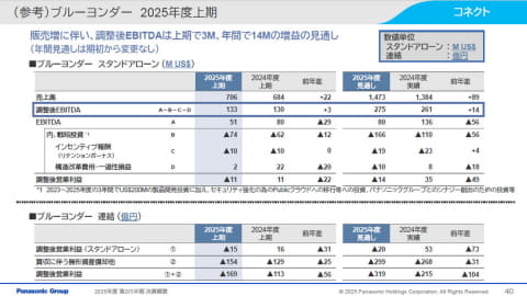 パナソニック コネクトの2025年度通期(2025年4月~2026年3月)の業績見通しについても上方修正。売上高は当初見込みより150億円増額とし、前年比3%減の1兆2800億円、調整後営業利益は当初見込みより40億円増額し、前年比3億円増の810億円とした。