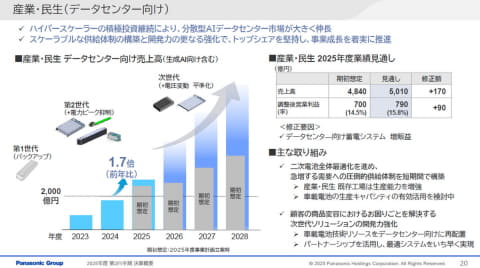 一方、パナソニックグループにおいて好調な事業が、データセンター向け蓄電システムである。生成AI市場の拡大に伴い、AIデータセンターへの投資が拡大しているのが理由だ。売上高は、期初には前年比1.5倍の成長を想定していたが、上期実績では1.9倍に伸長。今回の発表では通期見通しを、前年比1.7倍へと引き上げた。