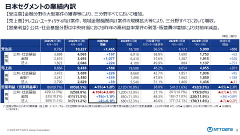 「公共・社会基盤、金融、法人のいずれも増収となり、金融、法人で増益となった。公共・社会基盤では、不採算損失が増加したほか、前年同期の中央府省における高利益率案件の剥落や、営業体制強化に伴う販管費が計画通りに増加している影響で減益になっている。また、日本セグメントの受注は各分野で好調であり、金融分野では大型案件の獲得があった」という。