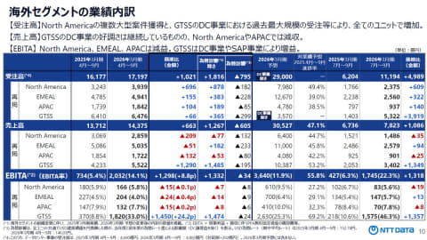 「売上高は為替影響を除くと、North AmericaとAPACが減収になった。North Americaでは、ヘルスケア分野における大型案件の解約、政権交代による公共案件の縮小が影響した。EMEALはUKが増益に転じているものの、ドイツの景気悪化が影響。特に、米国の関税の影響を受けている自動車関連顧客からの売上減少が見られる。APACでは、クラウドおよびセキュリティ領域が成長しているものの、通信機器販売の不調や、オーストラリアでの受注回復遅れが影響している。一方で、NTT DC REITへの固定資産譲渡を完了し、第2四半期に譲渡益として、8億8000万ドル(1295億円)を計上している。受注では、North Americaにおいて複数の大型案件の獲得があったほか、GTSSでは、データセンター事業において、過去最大規模の受注があった。すべてのエリアで受注額は増加している」と述べた。