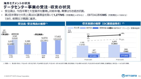 データセンター事業に関しては、売上高は前年同期比7.3%増の12億7700万ドル(1865億円)、EBITDAが同26.0%増の5億1300万ドル(749億円)、営業利益が同48.1%増の2億7700万ドル(404億円)となった。受注額は前年同期比9.2%増の32億8900万ドル(4802億円)、2025年9月末時点の受注残高は174億200万ドル(2兆5910億円)で、2025年3月に比べて24億2800万ドル(3519億円)増加している。