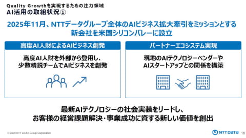 また、NTTデータグループでは、2025年11月中旬以降には、AIビジネスの拡大を牽引することをミッションとする新会社を米国シリコンバレーに設立することを明らかにした。