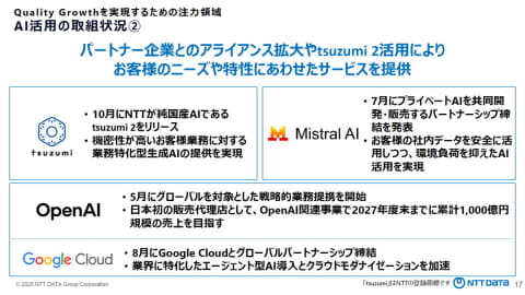 また2025年7月には、NTT DATAがMistral AIとプライベートAIを共同開発・販売するパートナーシップを締結。顧客の社内データを、安全に活用しながら、環境負荷を抑えたAI活用を目指すという。さらに2025年5月には、Open AIとグローバルを対象とした戦略的業務提携を開始。日本初の販売代理店として、OpenAI関連事業において、2027年度末までに累計1000億円規模の売上を目指すことになる。