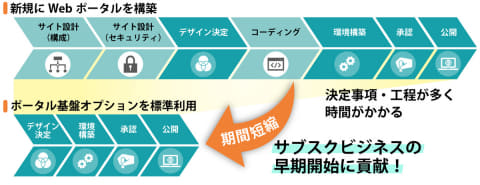 今回はそのラインアップに追加された「ポータル基盤オプション」では、Webポータルの迅速な構築を支援する。具体的には、強固なセキュリティを備える米Acquiaのコンテンツ管理システム上で、サブスクリプションビジネスに必要なWebポータルを構成する申し込み用Webページ、契約者向けWebページのテンプレートを、日立ソリューションズが開発して提供するため、構築期間を大幅に短縮できるとのこと。