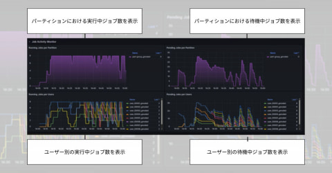 具体的には、パーティション別およびユーザー別に、それぞれの実行中・待機中のジョブ数を確認できる。これにより、例えば、ジョブが実行されている時間帯を可視化し、実行が集中している時間があれば分散するよう調整したり、一定時間内におけるGPU利用率を確認し、パラメータを調整することでリソース効率を最適化したり、といった使い方が可能になるとのこと。