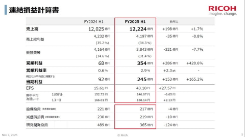 リコーの2025年度上期連結業績、オフィスサービスの成長と経費コントロールの継続で増収増益を達成