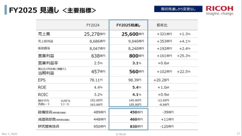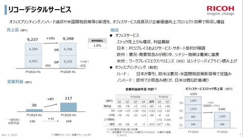 なお、セグメント別では、上期の為替影響の増益を反映したリコーデジタルプロダクツが上方修正。米国関税影響によって、リコーグラフィックコミュニケーションズは下方修正。リコーデジタルサービスも関税影響の項目変更で営業利益だけ下方修正した。