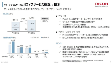 「オフィスプリンティングは、日本ではハードの台数増加や売価マネジメントの効果により計画を達成。A4 MFPのポートフォリオを強化したことによって、一括案件の獲得数が増加し、A3 MFP案件の獲得にも寄与している。だが、欧州は景況の低迷、米州は第2四半期に米国関税政策の影響を受けた。ITサービスは、PCのリプレースにあわせて、サービス・サポート契約を獲得し、いい数字を出している。セキュリティや働き方改革関連の需要が強いのに加えて、自治体向けソリューションが伸長している。アプリケーションサービスでは、Microsoft 365やストレージサービスなどの情報系アプリが好調に推移し、RICOH kintone plusの契約数および顧客数も順調に増加している」という。