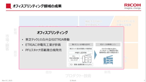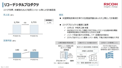 リコーデジタルプロダクツは、売上高が前年同期比24.6%増の802億円、営業利益が前年同期から33億円増の173億円。米国関税政策対応等での生産量変動はあったが、上期は計画通りの進捗だったという。また、リコーと東芝テックによる合弁会社としてスタートした複合機の生産会社であるエトリアは、2025年10月から、沖電気工業(OKI)が参画。プロジェクトは着実に進展していると説明した。