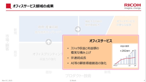 オフィスサービスでは、日本におけるストック売上の成長が加速。また、ワークプレイス一元管理ソリューション「RICOH Spaces」の提案、RICOHオンプレLLMスターターキットの発売によるAIソリューションの強化、欧州でのDocuWareの販売体制の増強、子会社化した独natif.aiによるAIの強化のほか、これらを他地域に展開したことが功を奏しているという。