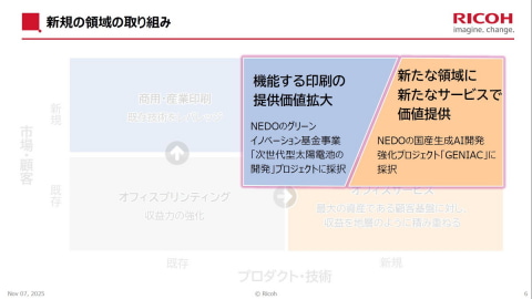 さらに、「新たな領域に、新たなサービスで価値提供」を行う領域として、リコーが持つマルチモーダルLLMの技術を生かして、「GENIAC」の開発プロジェクトに参画。「ここで開発したエンジンは無償公開するため、より多くの顧客との接点を生み出すことにつながる」とした。