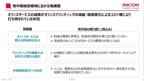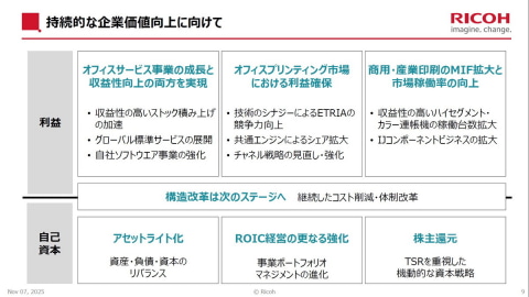 なお、「企業価値向上プロジェクト」は、2025年度上期だけで182億円の効果を創出し、「想定通りの効果を出している。事業の選択と集中の施策が着実に進捗しており、2つ事業を売却し、1つの事業を終息した。今後も継続して取り組む」(リコーの川口CFO)と述べた。