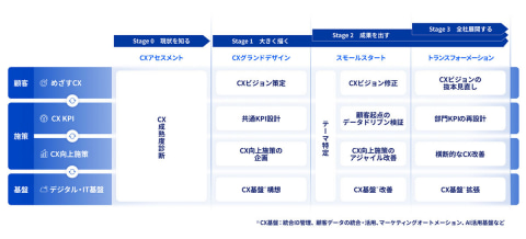 次の「Stage1」では、企業の現状を踏まえた上で、中長期的な目線で目指すべきCXビジョン、KPI、施策、CX基盤のグランドデザインを部門横断かつ整合が取れた形で描くとした。