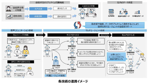 NTTドコモが独自に開発した音声コミュニケーション技術、マルチエージェント技術、代理エージェント技術の3つのエージェント技術、および会議状況のリアルタイム把握機能と社内のデータ資産を組み合わせることで、人間とエージェントがシームレスに会話し、会議内容に応じてエージェントが最適な支援を行ってくれるという。