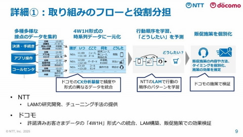 今回の取り組みは、NTTとNTTドコモが共同で推進した。NTTがLAMの研究開発およびチューニング手法を提供し、NTTドコモは許諾済み顧客データを「4W1H(誰が・いつ・どこで・何を・どうした)」形式へと統合してLAMを構築し、販促施策の効果を検証した。