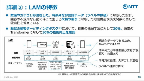 LAMの技術的特徴について倉沢氏は、「数値やカテゴリが混在する非言語の時系列データに対応した生成AIで、顧客の不規則な行動によって生じるデータの欠損や偏りに対しても、階層構造や損失関数にNTTの独自技術を採用している」と説明する。「NTTが定義した販促の顧客ターゲティングタスクにおいて、LAMは従来の機械学習手法に対して約30%、一般的なTransformer構造に対して約10%の性能向上を確認した」と、倉沢氏はその成果を強調した。