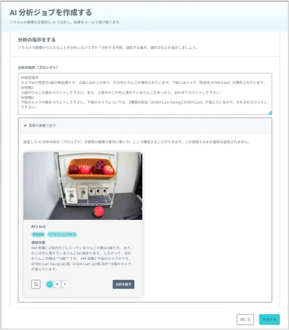 今回発表された「ソラカメAI」は、「ソラカメ」で撮影した映像(静止画)を生成AIが自動で分析し、その結果を通知する機能。ユーザーは管理画面上で、確認したいカメラを選択し、例えば「画像に写っている車両は何台ですか」「装置の赤いランプが点灯していますか」といった平易な日本語のテキストでAIに指示を入力すると、実際のカメラの画像を見ながらその場で指示が実行され、結果を確認しながら調整することもできる。