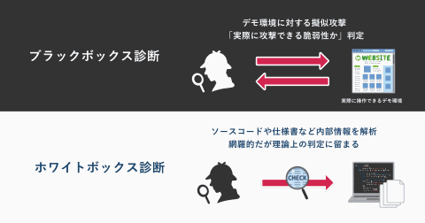 このため、ブラックボックス診断とホワイトボックス診断は互いに補完的な関係にあり、理想的な診断を行うためには併用が望ましく、GMO Flatt Securityのセキュリティエンジニアによる脆弱性診断・ペネトレーションテストでも、顧客からソースコードとデモ環境を提供してもらい、両手法の併用を標準としているという。