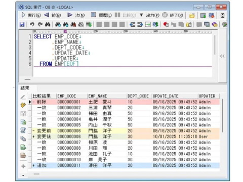 今回はそのうち、Oracle Database向けの製品を強化した。まず、テーブルデータの差分を表示できる機能を追加。SQL実行画面にてSELECT文を2回実行することで、前回のSELECT実行結果との差分を調査できるようになった。追加や削除、更新されたレコードはハイライト表示されるため、即座に差分のレコードが特定できる。