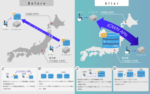 従来は遅延の観点から、同一拠点内に限定されていたストレージ間通信に、高品質・大容量・低遅延の特性を持つIOWN APN(NTT東日本の「All-Photonics Connect powered by IOWN」)を活用することで、東京~北海道間の長距離にわたる一つのストレージ空間に統合する。