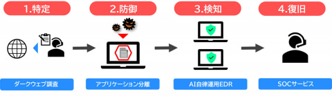 「Endpoint Cyber Resilience Suite」は、サイバーレジリエンスの向上に必要なエンドポイント対策を包括的に実現できるセキュリティソリューション。「特定」「防御」「検知」「復旧」のそれぞれに対応する4つのソリューションから構成されており、対策の優先度やコストに合わせて段階的に導入できるサービスメニューが提供されるという。また、AIによる自動化とALSIのトータルサポートにより、中堅・中小企業でも手軽に導入・運用でき、サイバーレジリエンス強化を早期に実現可能な点も特徴とした。