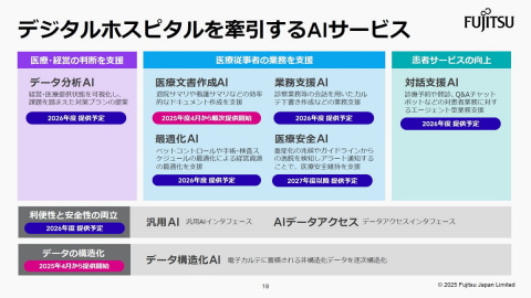 デジタルホスピタルサービスの実現に向けては、2026年度から2027年度までに、医療経営状態を可視化して経営改善を行うための「データ分析AI」サービス、医療業務をAIにシフトし、働き方改革を促す「文書作成AI」や「業務支援AI」、患者サービスの向上のための「対話支援AI」の各サービスを提供する計画だ。
