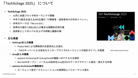 日本アイ・ビー・エム株式会社(以下、日本IBM)は25日、10月に米IBMが米国フロリダ州にて開催した年次イベント「IBM TechXchange 2025」での発表内容について説明会を実施した。IBM TechXchange 2025は、IT開発者および技術者向けの年次イベントで、今回が4回目の開催となる。