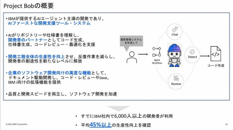 Project Bobとは、IBMが提供するAIエージェント主導の開発支援ツールシステムのことだ。AIがリポジトリーや仕様書を理解し、開発者のパートナーとしてコードの生成や仕様書の生成、コードレビュー、そして最適化を支援する。また、企業のソフトウェア開発向けの高度な機能として、ドキュメント駆動開発やコードレビュー、JavaおよびIBM i向けの拡張機能を提供している。