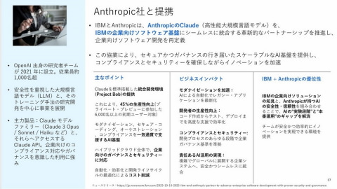 Anthropicとの提携により、同社のLLM「Claude」をProject Bobに標準搭載して提供できるようになった。「AnthropicのLLMとIBMの企業向けソフトウェア開発基盤をシームレス統合することによって、企業のソフトウェア開発の複雑なニーズに応えることができる」と張氏は述べている。