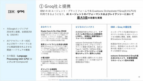その中でも特に注目されるのは、Groqと提携し、watsonx OrchestrateでGroqのLLM特化型LPU(Language Processing Unit)を利用できるようになったことだ。従来のLLM処理に用いられていたGPUサーバーとは異なり、LPUは生成AI向けに特化して設計されたコンパイラやチップ接続技術を採用していることから、「watsonx OrchestrateでLLMの推論処理を最大5倍高速化することに成功した」(長田氏)という。