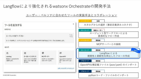 また、DataStaxが開発したオープンソースの生成AIワークフローツール「Langflow」とwatsonx Orchestrateの統合も発表した。この統合により、従来の業務ユーザー向けのノーコード・ローコード機能に加え、開発者向けにも柔軟なローコード開発環境が提供できるようになった。長田氏は、「幅広い開発者のニーズに対応し、マルチエージェントのオーケストレーションをより効率的に実現できるようになる」と述べている。