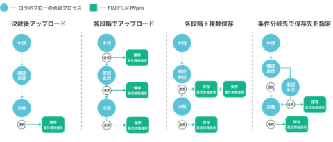今回発表された連携オプション「コラボフロー for FUJIFILM IWpro」は、「コラボフロー」のワークフロー(申請・承認プロセス)と連動し、申請書に添付されたファイルや申請内容から作成した帳票(PDF)を、指定したFUJIFILM IWproフォルダに自動で保存・整理できる製品。
