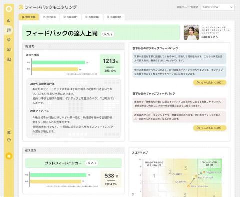 このうち「個人診断カルテ」では、AIが過去のフィードバック履歴を蓄積・分析し、回数だけでなく内容の充実度や改善傾向などを把握することが可能。履歴は時系列で表示され、スキルの成長度合いを継続的に追跡できるとのこと。