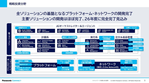 樋口プレジデント・CEOによると、ベースとなる統合プラットフォームと、サプライチェーンネットワークの開発はすでに完了。さらに、計画系や実行系、注文管理および返品管理、AIオーケストレータおよびAIエージェントもほぼ完成しており、「2026年度までに、新たなコグニティブAI、統合プラットフォーム、サプライチェーンネットワークを含めた、エンドトゥエンドソリューションの開発および整備がすべて完了する予定である」としている。