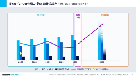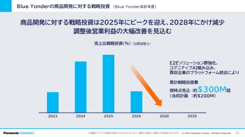 また、「コグニティブソリューションへの移行によって、SaaS比率の上昇、SaaSの粗利率の改善、限界利益の改善、固定費削減が進展し、調整後EBITDAを大幅に増加させることができる。これに加えて、戦略投資が2025年度を境にピークオフする。Blue Yonder単独の調整後営業利益も、間もなく黒字化を見込む」とも説明。Blue Yonder単独では、2025年度の調整後営業利益で1400万ドルの赤字見通しとしているほか、2026年度を収益改善フェーズと位置づけているものの、黒字化への道筋に手応えを示している。