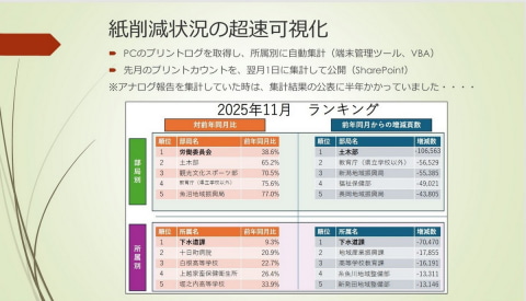 モバイルパソコンの導入や、制約なくインターネットサービスが利用できるようになったことで、職員が業務効率化を実感しているのはもちろん、ペーパーレス化も進んだ。庁内全体で2020年度から2024年度にかけて紙の使用量が約40%減となり、特に佐藤氏の所属するICT推進課では「実感として99%は紙を削減できている」という。