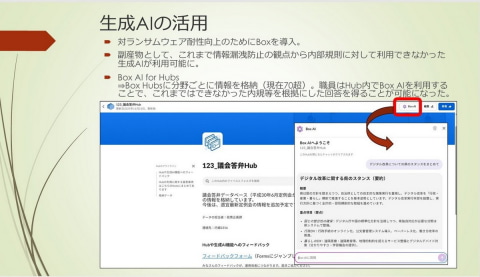 「Box AI for Hubs」も活用している。これは、社内ポータルに集約されたファイルをAIで検索し、大量の情報の中から必要な情報を引き出せる機能だ。「外部に出せない情報をBoxという安全な環境に格納し、生成AIで回答が得られるようになった。これまで人に聞いていたことをAIに聞くという業務環境の変化を根付かせていきたい」と佐藤氏は述べている。
