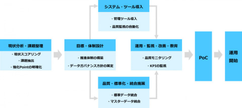 データマネジメントの現状分析を行い、ベストプラクティスに沿って組織やスコープを限定したスモールスタートとすることで、迅速に価値を実証するほか、段階的に全社展開へと拡大する柔軟な導入支援も可能。加えて、策定したルールや仕様に基づいた製品導入の支援にも対応するとしている。
