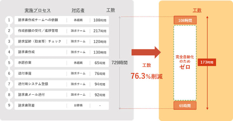 こうした環境に「請求業務のゼロ化」を導入した結果、どのような請求書を作成すべきかといった解釈や締め切り日の計算、後続処理の判断が自動化され、メールの目視確認、ステータス管理用アプリの起票・更新など、従来行っていた手作業を削減できたとのこと。さらに、必要なデータを整備し、後続の処理がスムーズに進むよう支援することで、業務プロセス全体の効率化を実現。76.3%の工数を削減できたとしている。