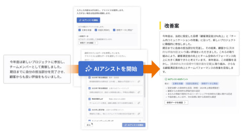 また評価においては、会社が設定している評価基準や過去の評価データをAIが分析し、客観的根拠に基づく評価コメントの案を生成する。さらに、評価者が記入したコメントをAIが精査し、被評価者の等級などと整合性を取ることで、評価の公平性を担保する機能も備えた。